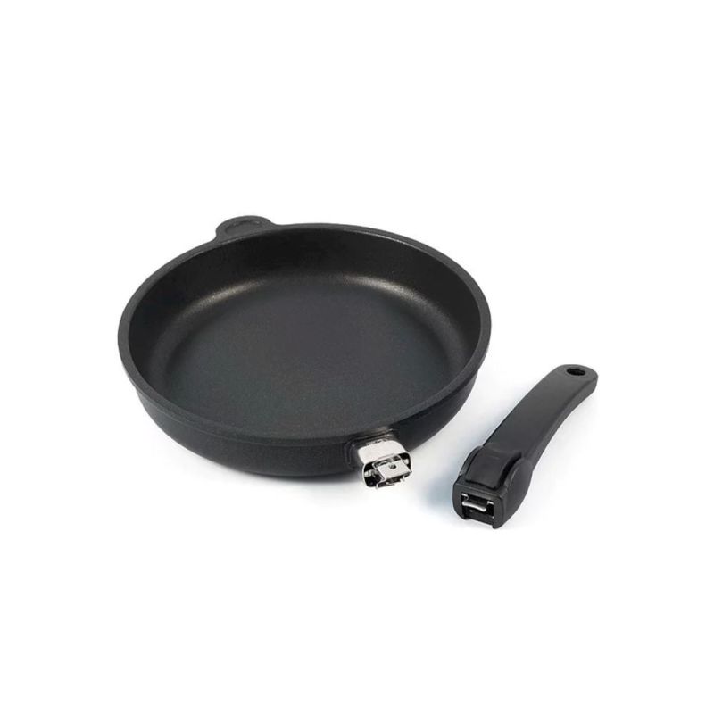 AMT тиган Ø 28 см със специално Lotan® незалепващо покритие и ергономична бързо‑освобождаваща се дръжка. Подходящ за всички котлони, включително индукция. Лесен за съхранение, безопасен и удобен за съдомиялна.